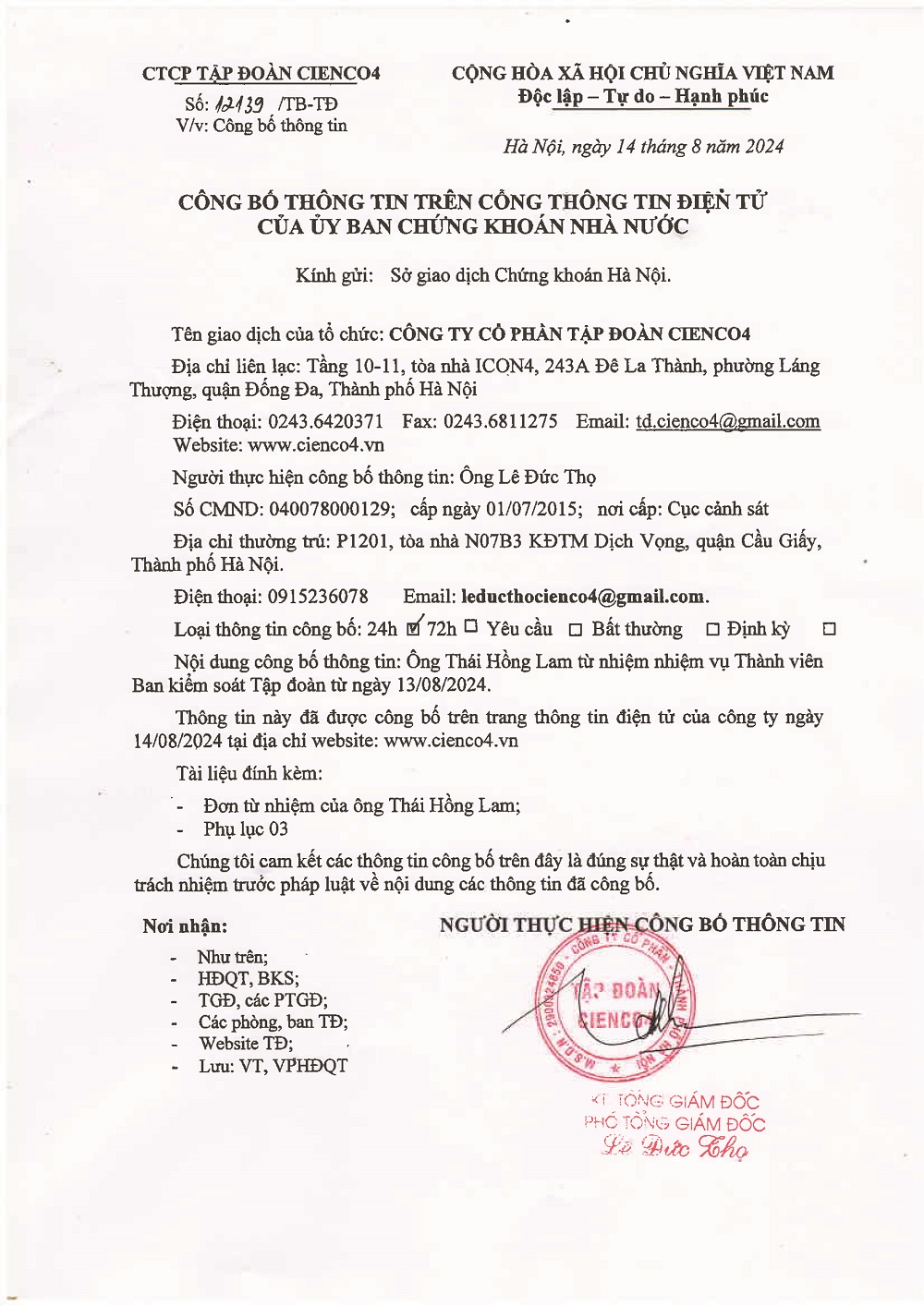 Trang Chủ / CBTT Ông Thái Hồng Lam từ nhiệm nhiệm vụ Thành viên BKS Tập đoàn từ ngày 13/08/2024