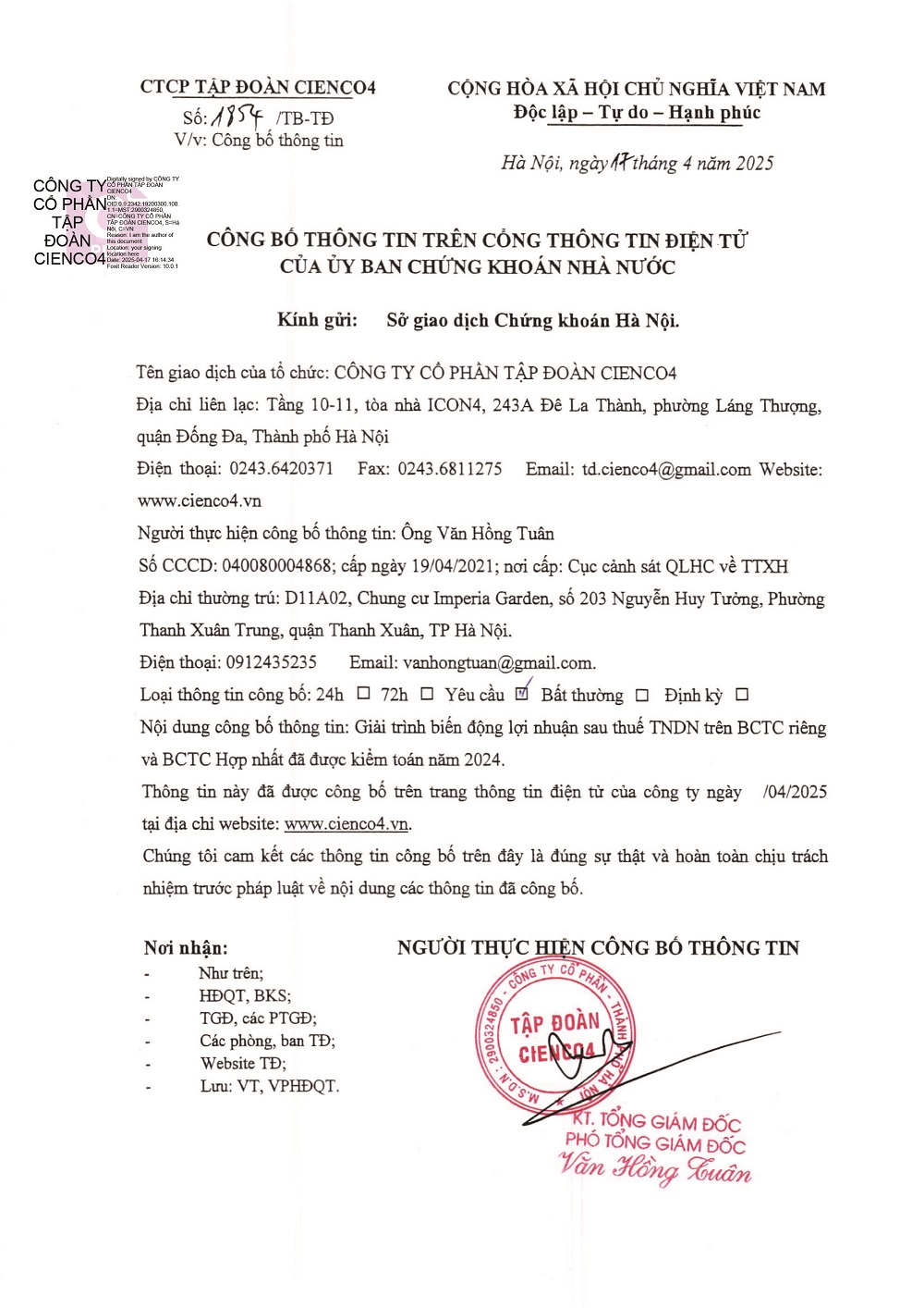Giải trình biến động lợi nhuận sau thuế TNDN trên BCTC riêng và BCTC hợp nhất đã được kiểm toán năm 2024