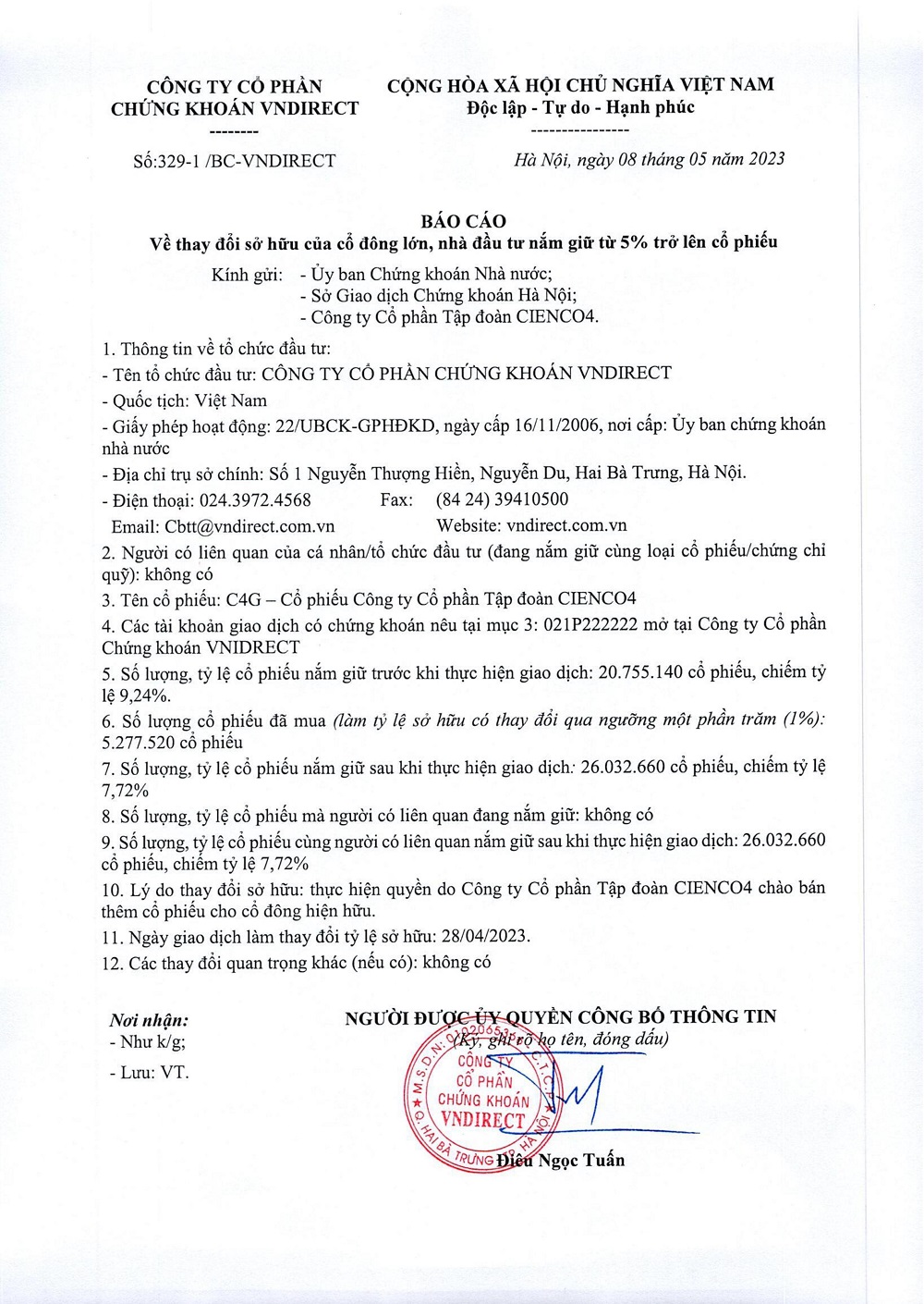 Báo cáo v/v thay đổi sở hữu của cổ đông lớn, nhà đầu tư nắm giữ từ 5% trở lên cổ phiếu
