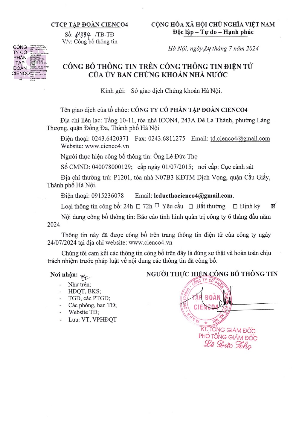 CBTT Báo cáo tình hình Quản trị Công ty 6 tháng đầu năm 2024