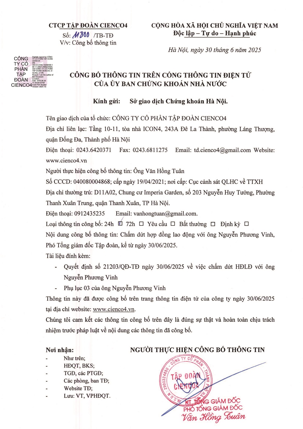 CBTT Chấm dứt HĐLĐ với ông Nguyễn Phương Vinh, Phó Tổng Giám đốc Tập đoàn từ ngày 30/6/2025