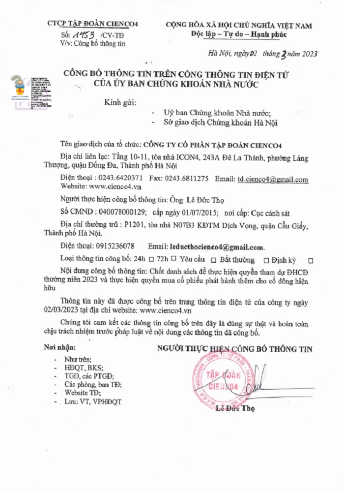 CBTT Chốt danh sách cổ đông để tổ chức ĐHCĐ thường niên năm 2023