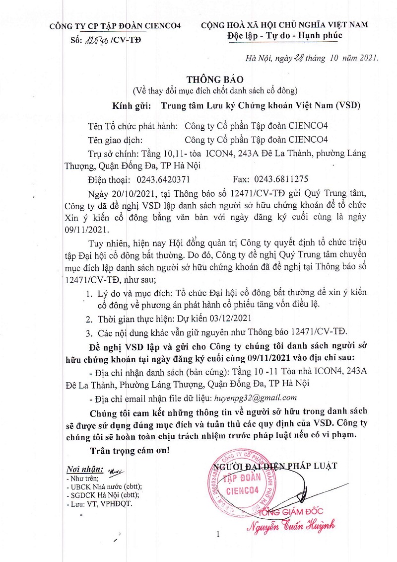 CBTT Chốt danh sách cổ đông tham dự ĐHCĐ bất thường