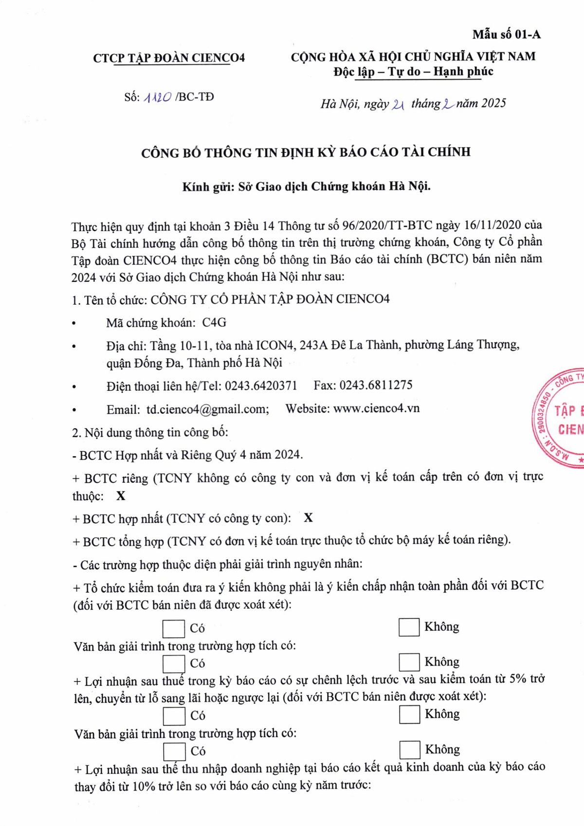 CBTT Định kỳ BCTC Quý 4/2024