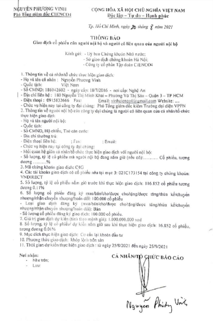 CBTT Giao dịch cổ phiếu của ông Nguyễn Phương Vinh – Phó Tổng Giám đốc Cienco4