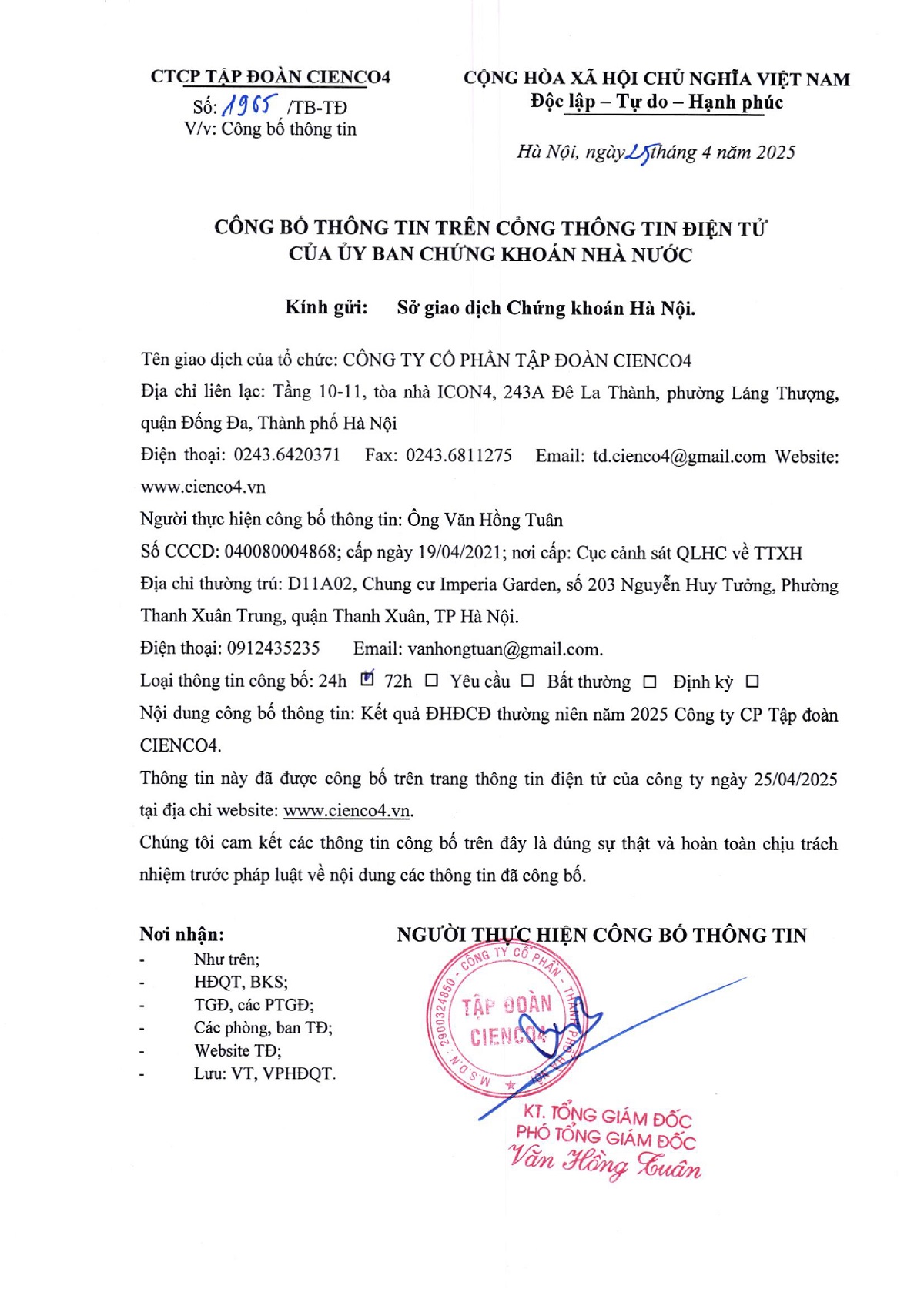 Trang Chủ / CBTT Kết quả ĐHĐCĐ thường niên năm 2025 của Công ty CP Tập đoàn CIENCO4