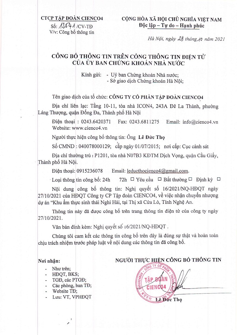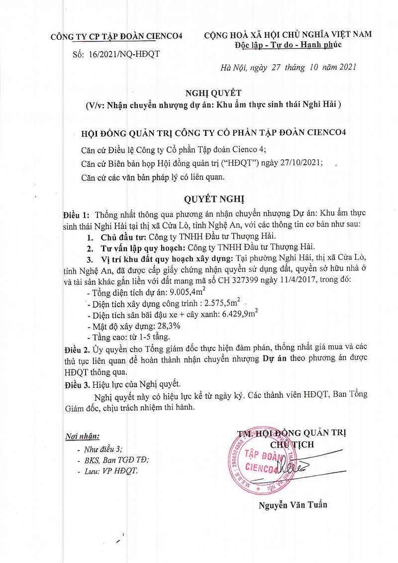 CBTT Nghị quyết của HĐQT v/v nhận chuyển nhượng Khu ẩm thực sinh thái Nghi Hải, Thị xã Cửa Lò, tỉnh Nghệ An