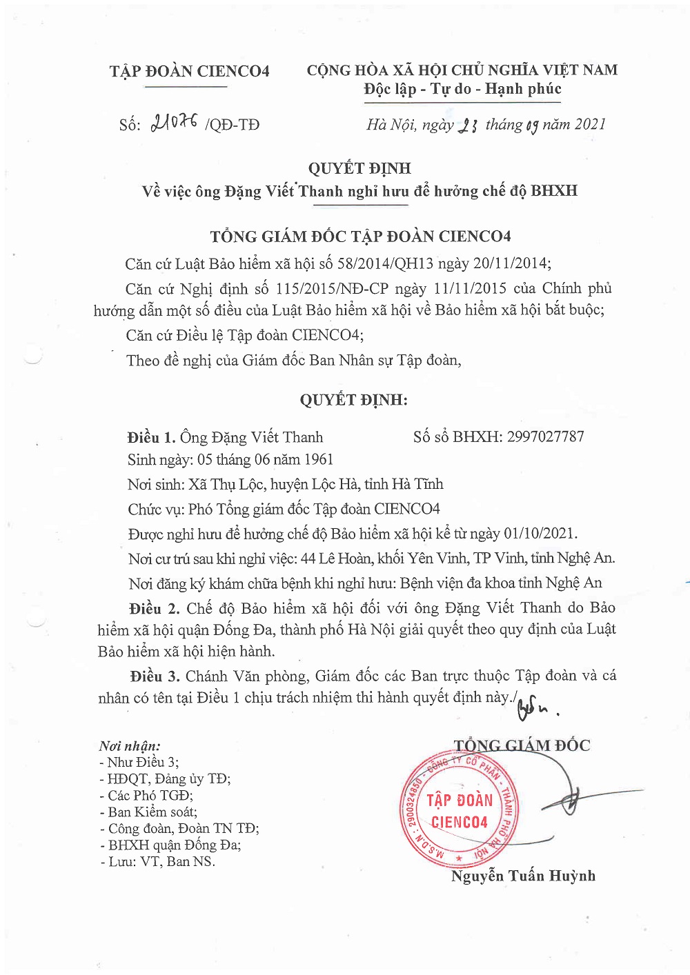 CBTT Ông Đặng Viết Thanh – Phó Tổng giám đốc Tập đoàn nghỉ hưu hưởng chế độ BHXH từ ngày 01/10/2021