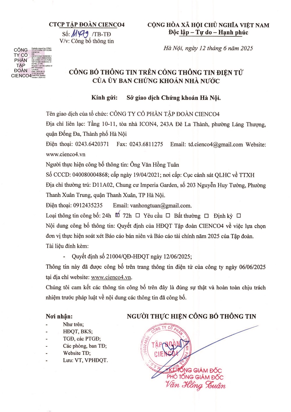 CBTT QĐ của HĐQT Tập đoàn CIENCO4 v/v lựa chọn đơn vị soát xét Báo cáo bán niên và BCTC 2025 của Tập đoàn