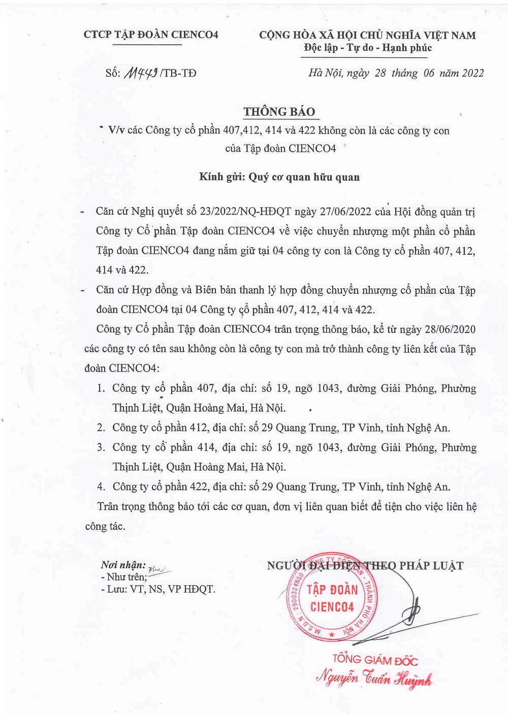Trang Chủ / Công ty CP 407, 412, 414 và 422 trở thành công ty liên kết của Tập đoàn Cienco4 kể từ ngày 28/6/2022