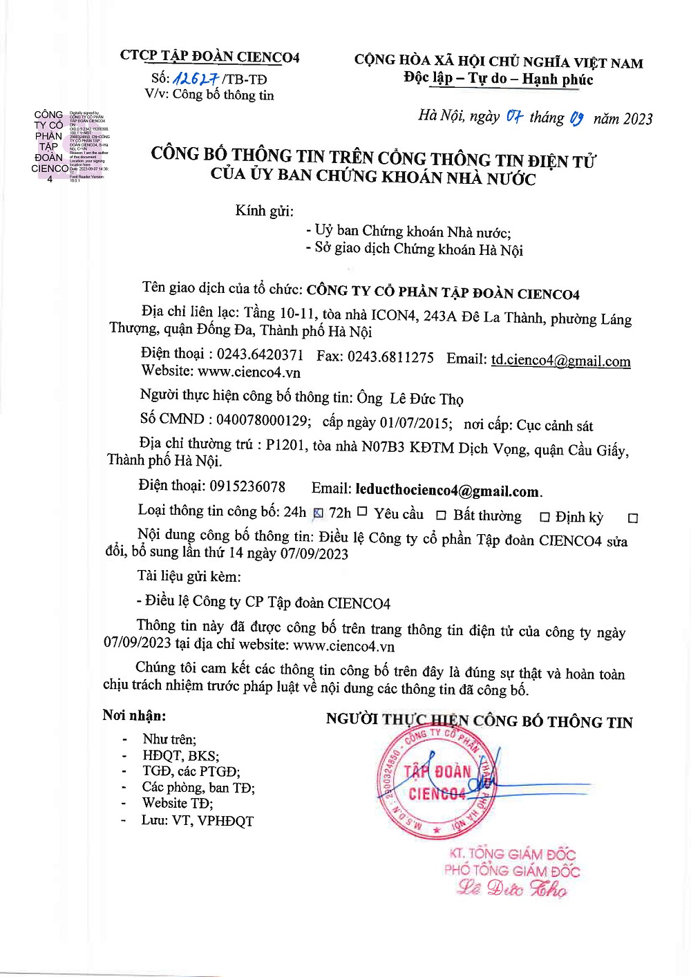 Trang Chủ / Điều lệ Công ty CP Tập đoàn CIENCO4 sửa đổi, bổ sung lần thứ 14