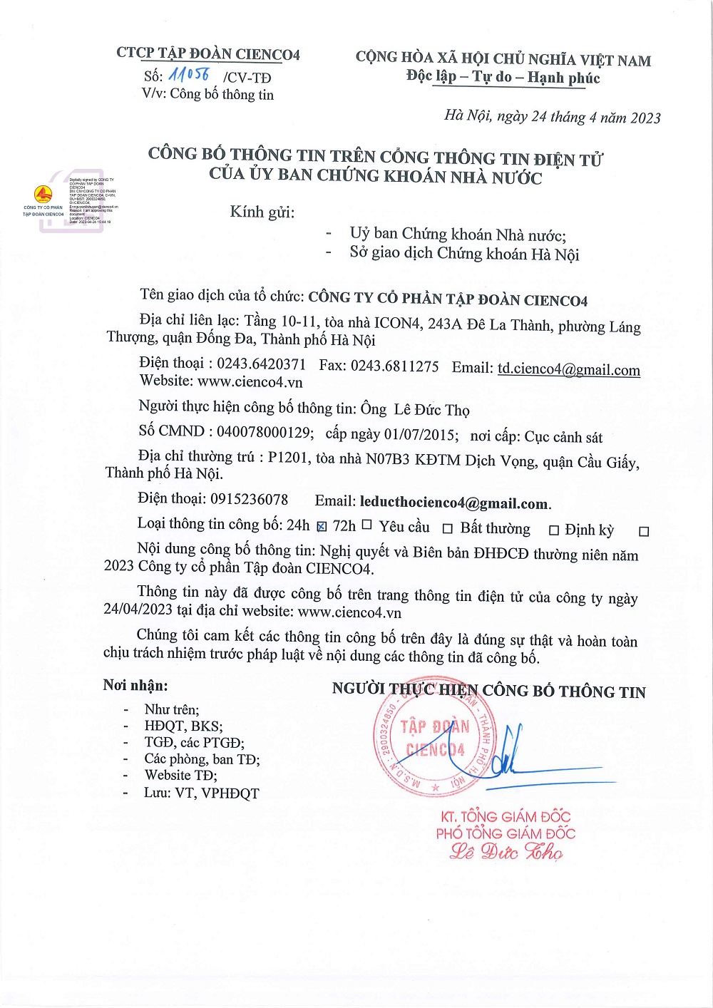 Nghị quyết và Biên bản ĐHĐCĐ thường niên năm 2023 Công ty CP Tập đoàn CIENCO4
