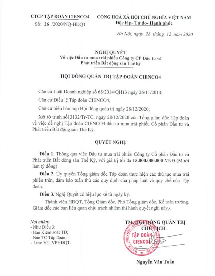 Trang Chủ / Nghị quyết về việc đầu tư mua trái phiếu của CTCP Đầu tư & PT BĐS Thế kỷ