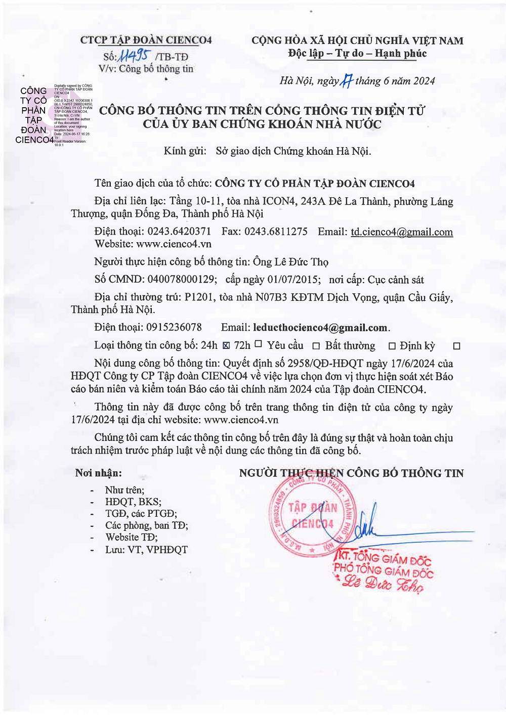 CBTT Quyết định của HĐQT v/v triển khai thực hiện phương án phát hành cổ phiếu để trả cổ tức năm 2024