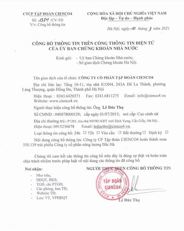 Trang Chủ / Thông báo về việc hoàn thành mua trái phiếu Công ty CP năng lượng Bắc Hà